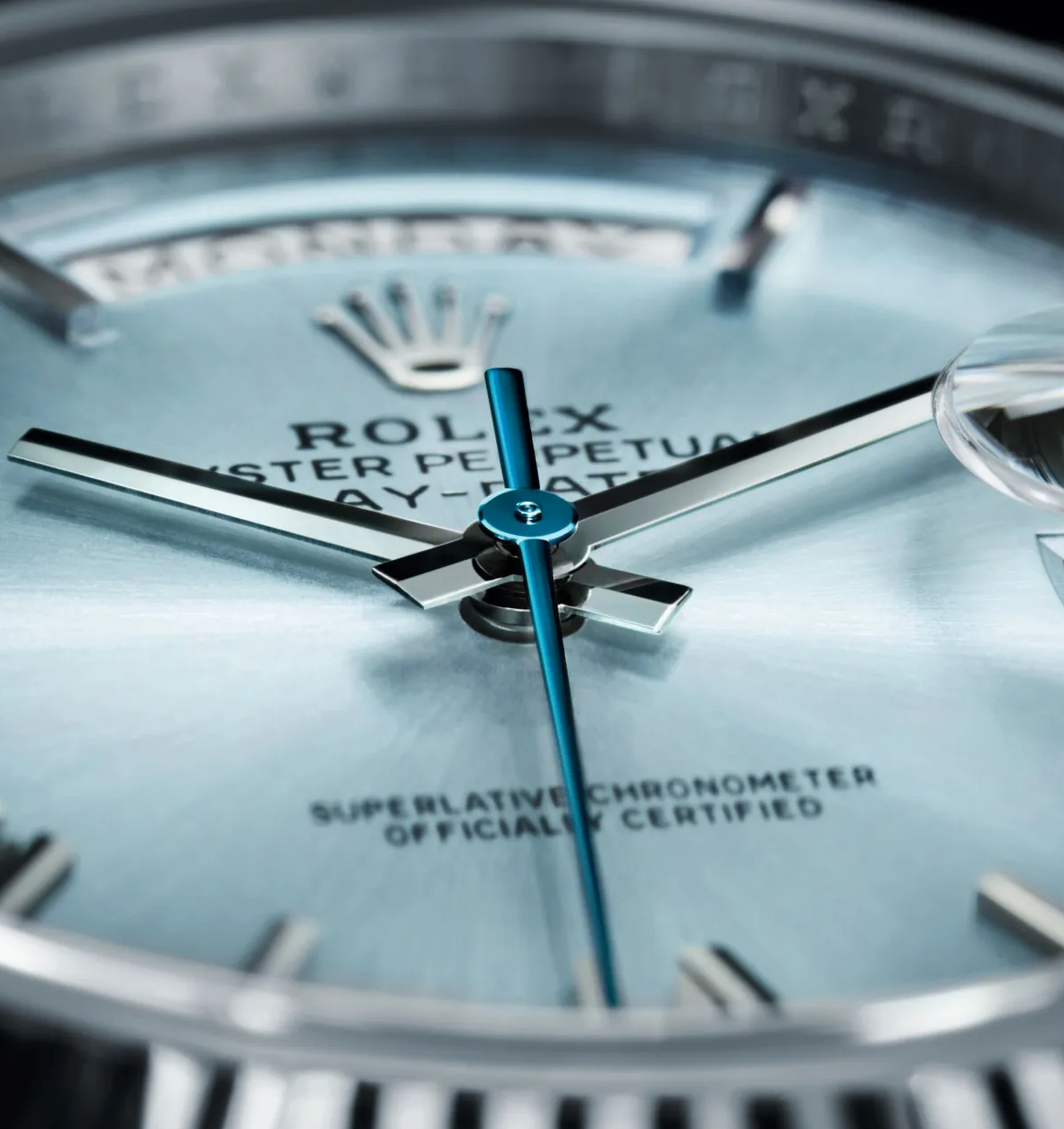 Manecillas en oro blanco de 18 quilates, revestimiento azul en el segundero mediante PVD (deposición física de vapor).